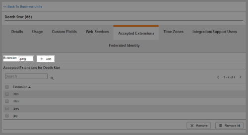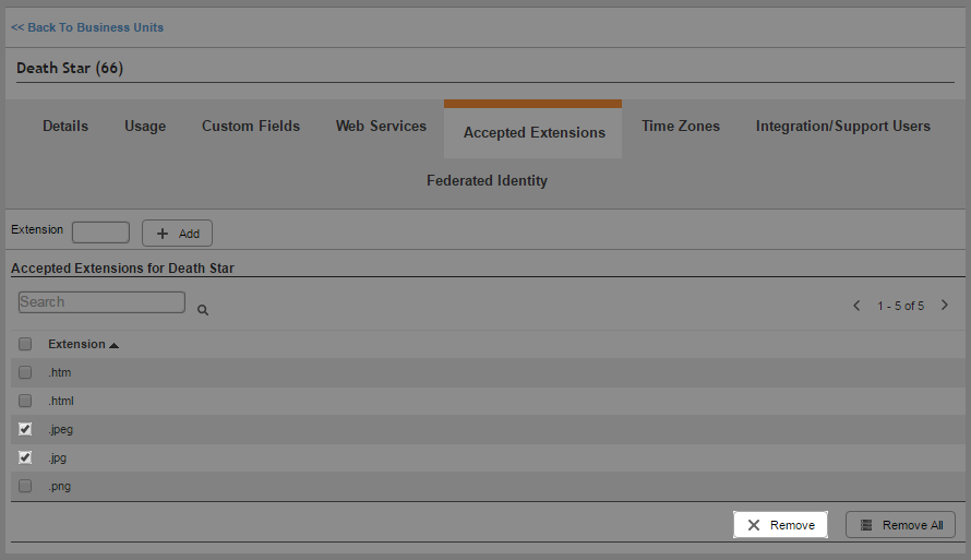 4. Select the checkboxes corresponding to the extensions you want to remove in the Accepted Extensions for Business Unit table. Click Remove. If you want to remove all extensions, click Remove All.