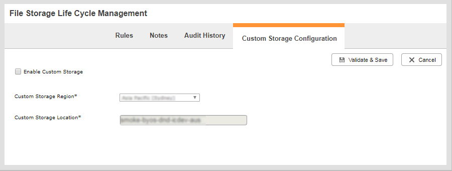 6. For Custom Storage Location*, type an existing storage location name that is configured for the custom storage region you have selected.