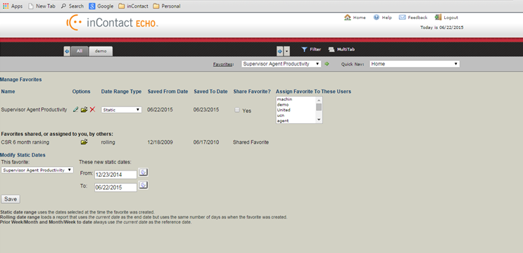 - A Rolling date range loads a report that uses the current date as the end date but uses the same number of days as when the Favorite was created.