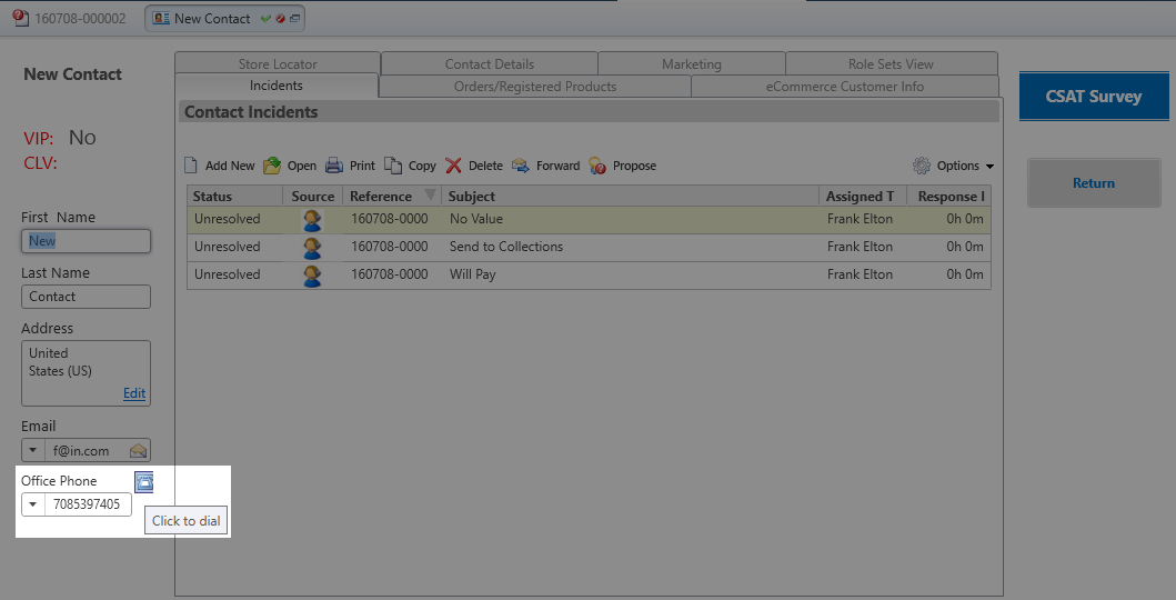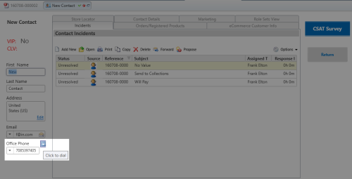 The Click-To-Dial button appears next to the Office Phone for the contact associated with an incident or task.