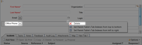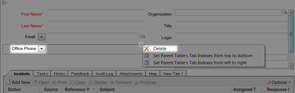 Click the Office Phone field to reveal a right-facing arrow in the upper right-hand corner of the field, and click Delete.