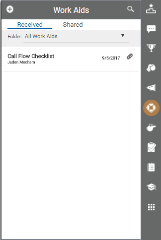 - Click the Work Aids icon on the toolbar to display the work aids pane, which opens on a tab with a list of work aids you have Received. If you do not see the work aid you want, you can search for it by clicking the magnifying glass in the upper right corner of the pane. You can also filter your display by folder if your organization stores work aids in this way.